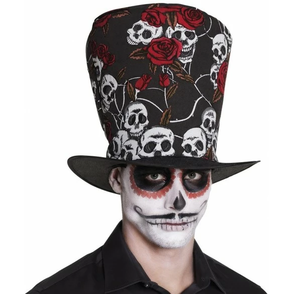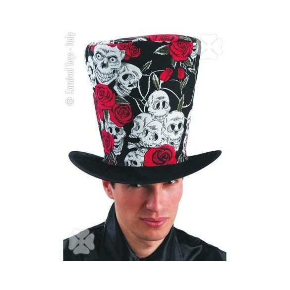Chapeau de superstar du rock avec motif crane et roses pour vos déguisements à thème rock ou Halloween.2 modèles assortis suivant arrivage.
